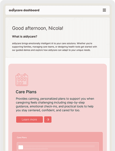 Unlock the full potential of AI with our emotionally intelligent models designed to support the diverse needs of caregivers, families, and real-life care. An AI platform designed to support the complexity of real-life care.