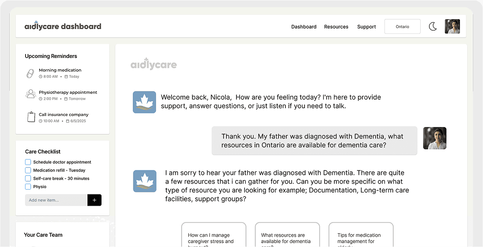 Aidly Care empowers Canadians with emotionally intelligent AI and tailored support that transforms caregiving, health management, and daily wellness, with genuine understanding built in.